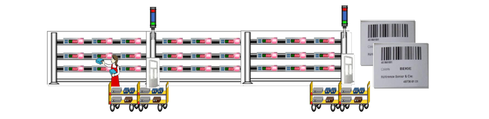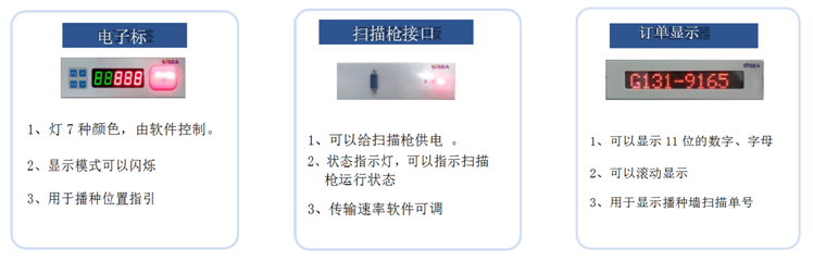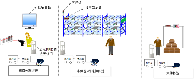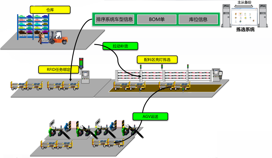 步骤一:小车进入停靠点后,自动触发感应拣选车上的RFID标签内容,并显示在订单显示器上。如果在当前工位2个小车都有拣选任务,三色灯将会亮起绿灯和黄灯。否则只会其一种颜色灯。步骤二:根据亮灯位置和指示数量,从对应位置上取出物料放入到拣选车上,当取出物料后,标签通过感应自动熄灭。如果手从错误的位置取出物料,当前错误位置的标签将会快速闪烁为红色,同时三色灯的红灯也快速闪烁。必须拍灭报警位置的红色闪烁标签后,方可以进入正确位置进行拣选。